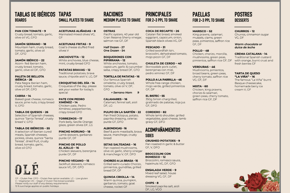 Spain is a vibrant and colourful country where beautiful, fresh food is perfectly paired with warm and friendly people. At Ole, we want you to experience just that, so all our dishes from Tapas to Rac...