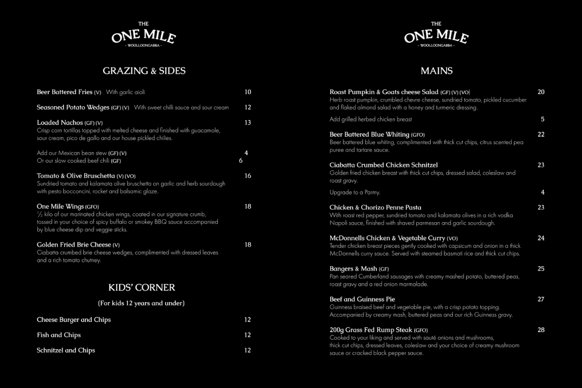 At The One Mile Woolloongabba, our offering consists of small, but purposeful menu including one cut of steak, hand crafted burgers, rubbed chicken wings, beer battered fish, and the like. We have ...